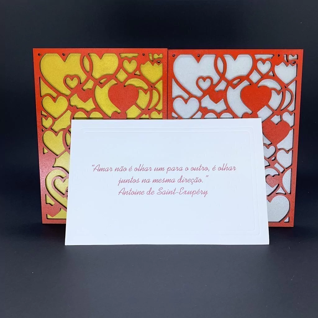 Cartão especial para o Dia dos Namorados feito com 2 camadas em MDF 3mm pintado e colado tamanho 13,0cmX19,5cm, acompanha 1 envelope tamanho 14,0cmx20,5cm e uma mensagem impressa em papel cartão gramatura a partir de 120g.